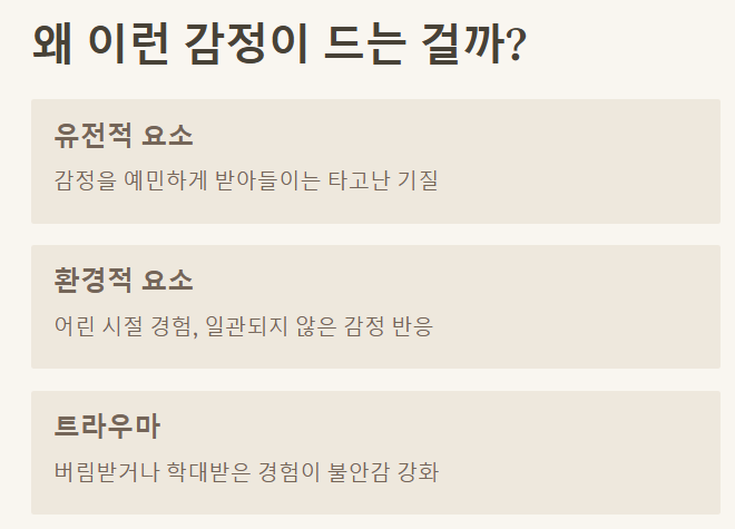 ✅ 어린 시절의 경험: 부모님이 너무 엄격하거나, 감정을 일관되게 받아주지 않았을 때 이런 감정 조절 어려움이 생길 수 있어요.