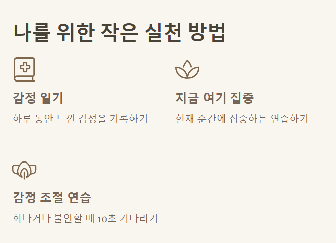 1️⃣ 감정 일기 쓰기: 하루 동안 어떤 감정을 느꼈는지 기록해보세요. 감정을 글로 정리하면, 조금씩 나를 더 이해할 수 있어요.
