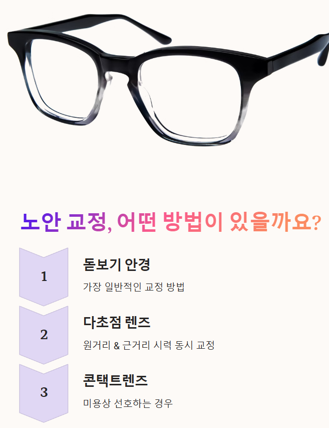 - 너무 늦게 착용하면 눈이 더 피로해질 수 있으니, 노안이 시작되면 적절한 시기에 안경을 맞추는 것이 좋아요!
