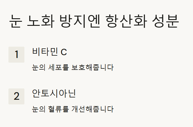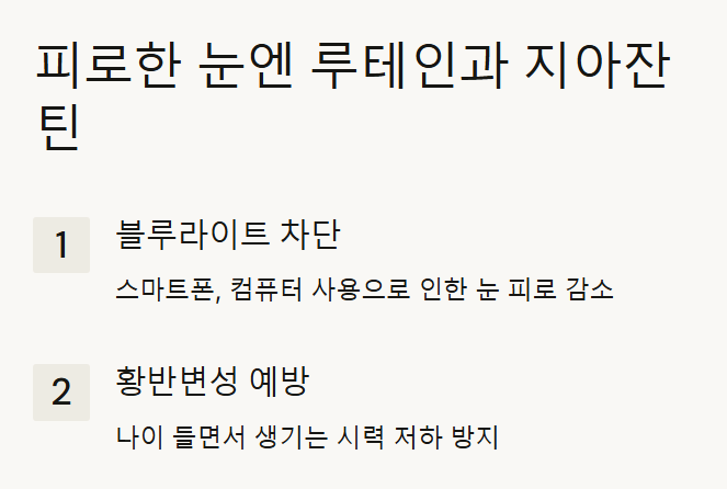 눈 건강에 중요한 또 하나의 요소는 산화 스트레스를 줄이는 것이에요. 쉽게 말해, 눈이 늙지 않도록 보호하는 항산화 성분이 필요하다는 거죠.