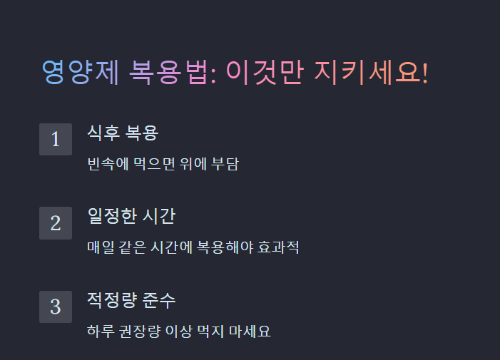 "좋다고 많이 먹으면 더 좋겠지?"라는 생각은 금물! 영양제마다 하루 권장량이 정해져 있으니, 너무 많이 먹으면 오히려 부작용이 생길 수 있어요.