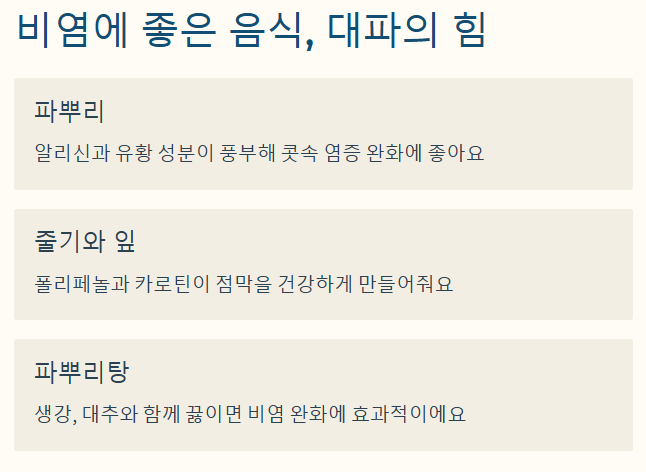 비염은 단기간에 확 좋아지는 병이 아니라, 점막이 천천히 회복되면서 증상이 나아지는 거니까요. - 식단에 파를 자주 넣어보세요.