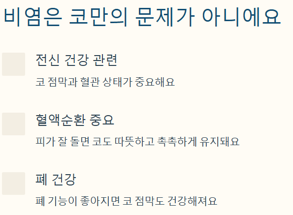 그래서 코만 관리하면 된다고 생각하기 쉬운데, 사실 비염은 몸 전체의 컨디션과도 관련이 깊어요.