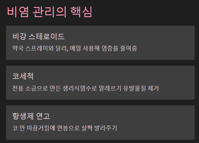 - 코를 파지 말고, 연고로 관리하세요: 코 점막이 계속 상처 입으면 비염이 악화되니까, 연고 바르면서 점막 회복시켜주는 것도 중요해요.
