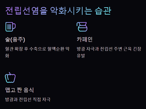 술을 마시면 혈관이 확장되면서 일시적으로 전립선 주변 혈류가 증가하는데, 이후 다시 혈관이 수축하면서 오히려 혈액순환이 나빠질 수 있어요. 특히 맥주, 소주 같은 도수가 낮은 술도 전립선에 자극을 주기 때문에 전립선염 증상이 있을 때는 가급적 금주하는 것이 좋습니다.