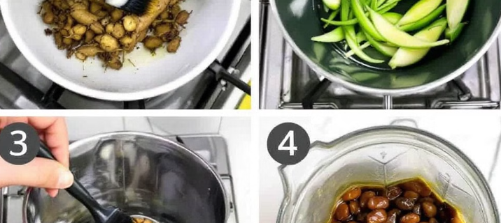 - 손질한 도라지, 배, 대추 달인 물을 한꺼번에 넣고 믹서기로 곱게 갈아주세요.