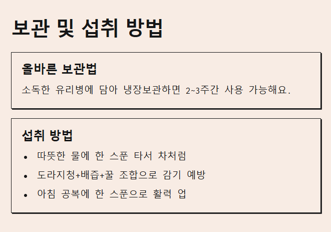 - 기침이나 목이 아플 때 → 따뜻한 물에 한 스푼 타서 차처럼 마시기