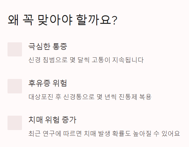 그냥 아픈 게 아니라, 신경을 따라 극심한 통증이 수개월씩 이어지기도 하거든요.